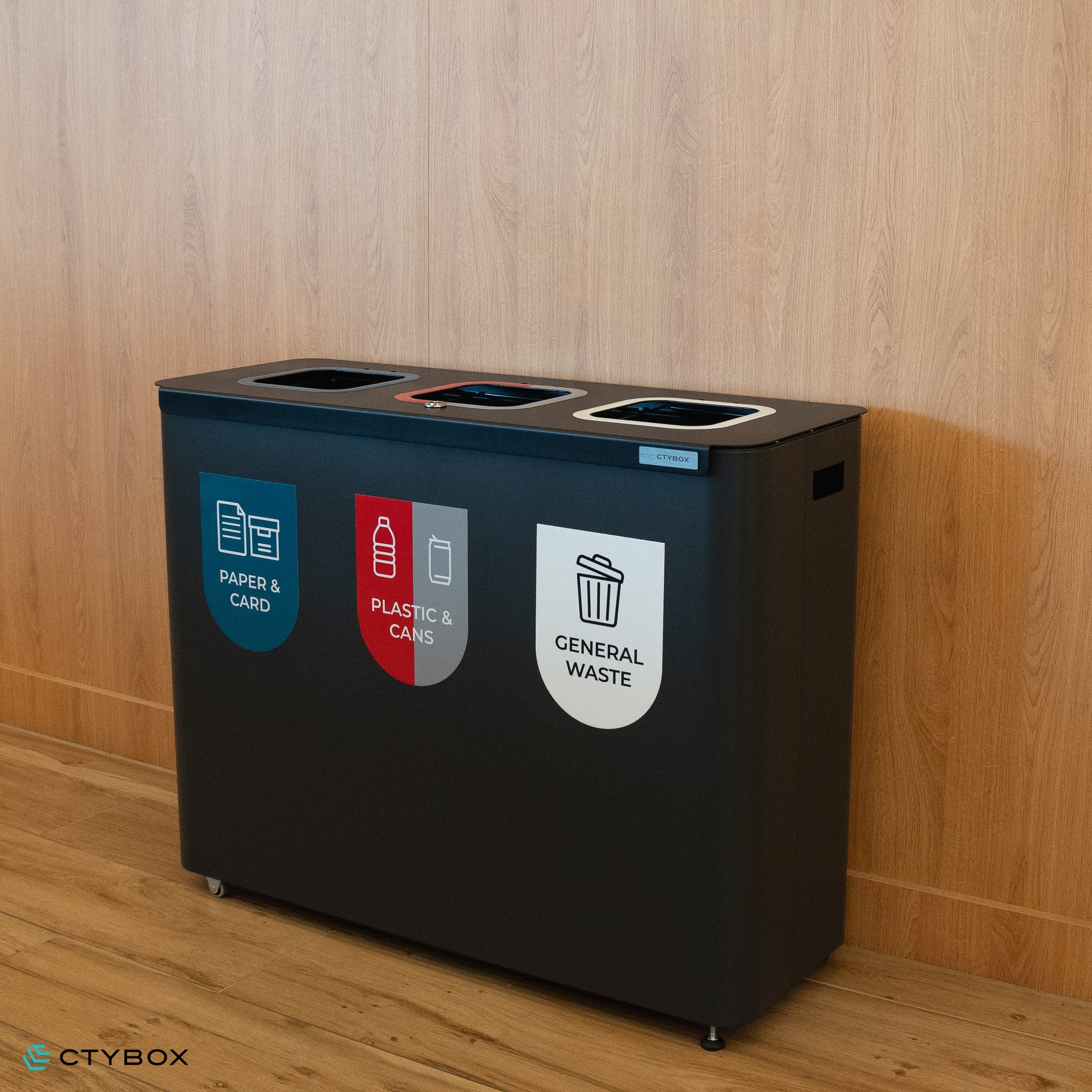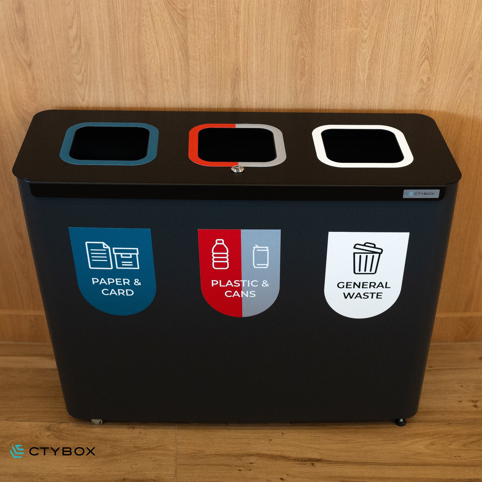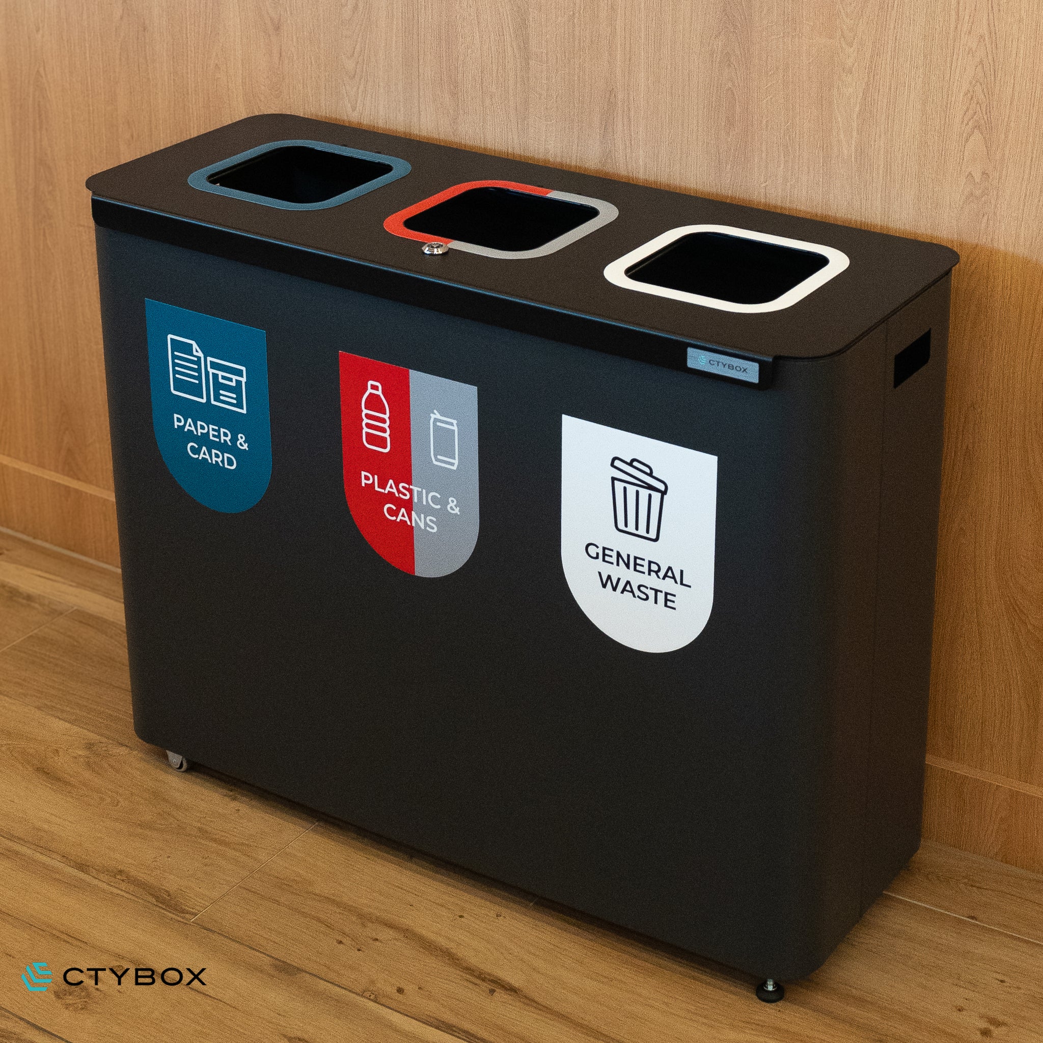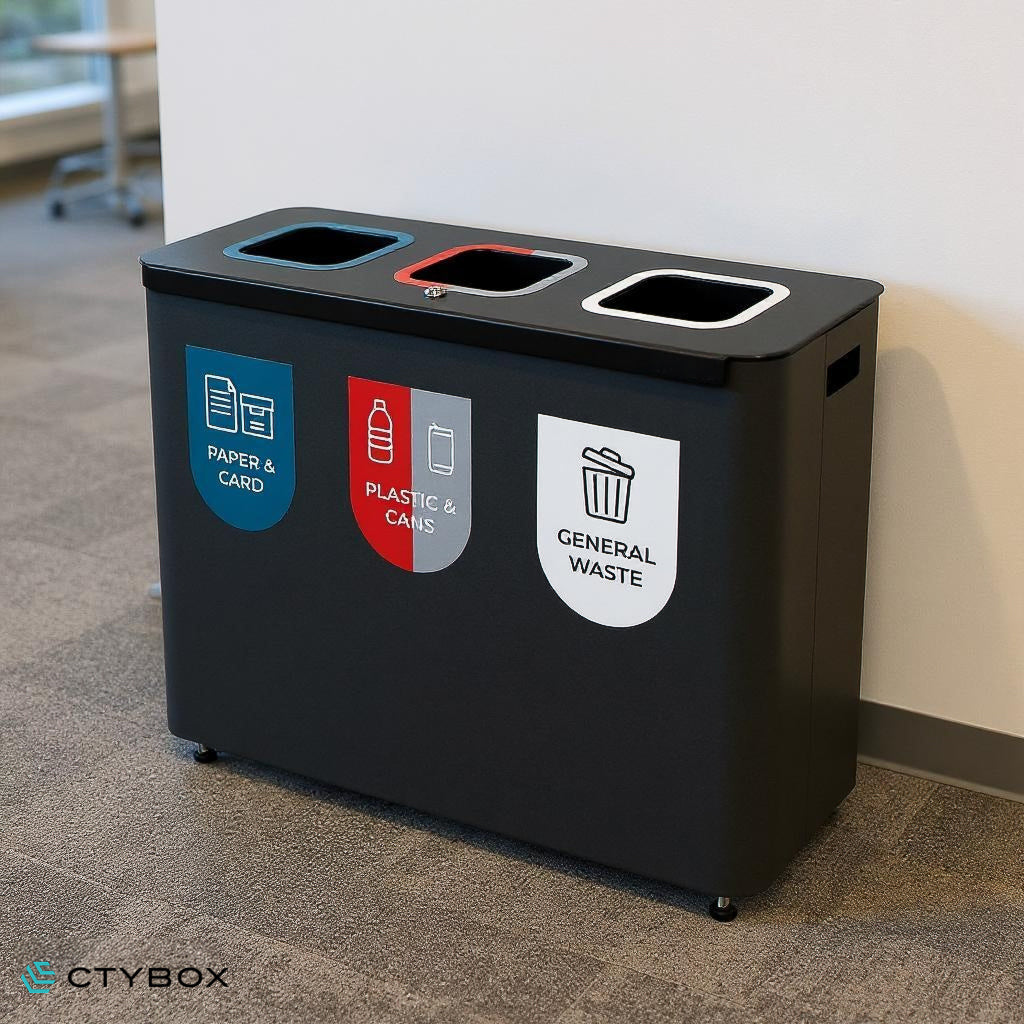 - Stylish and modern looking recycling station, perfect for various environments from offices and recreational spaces to airports and more