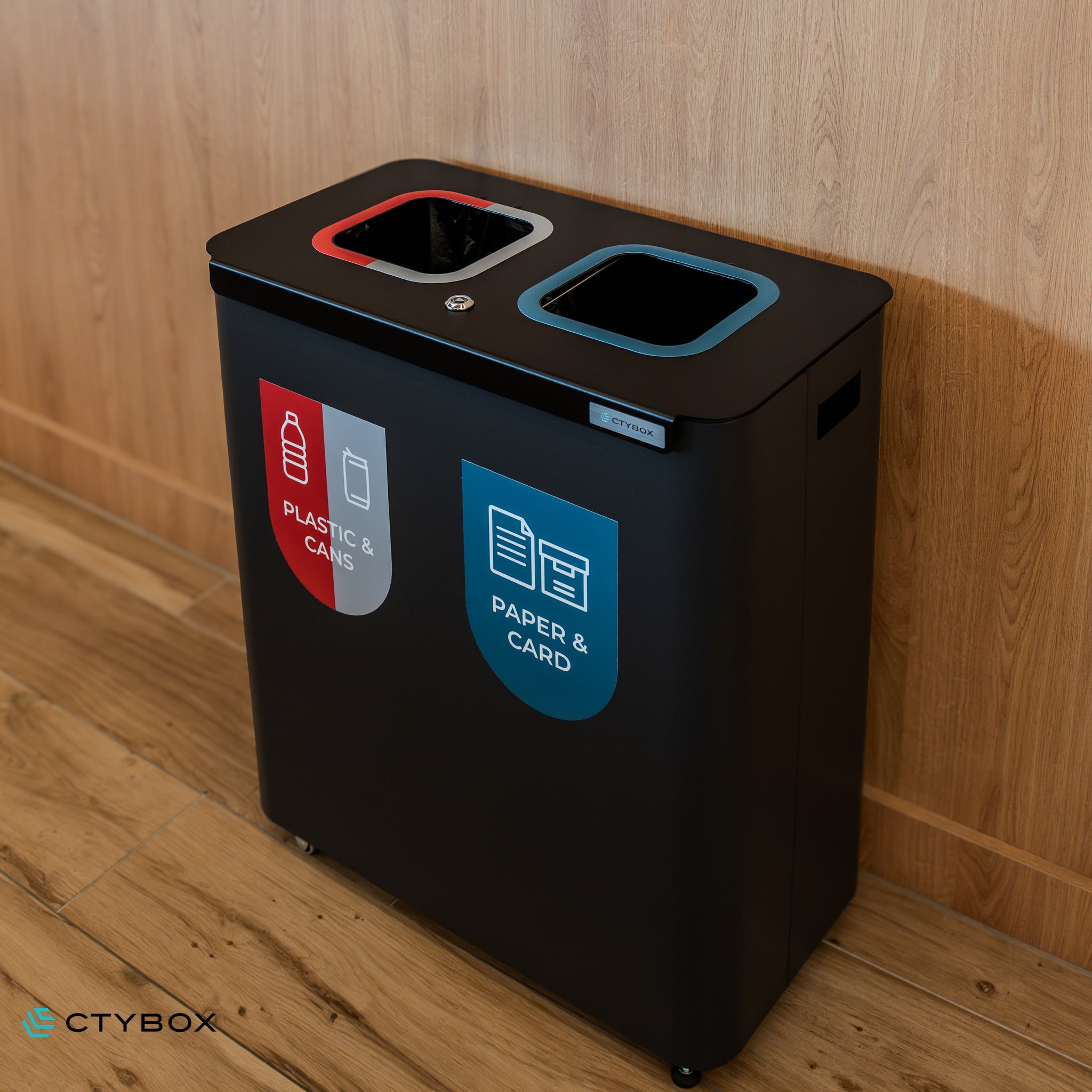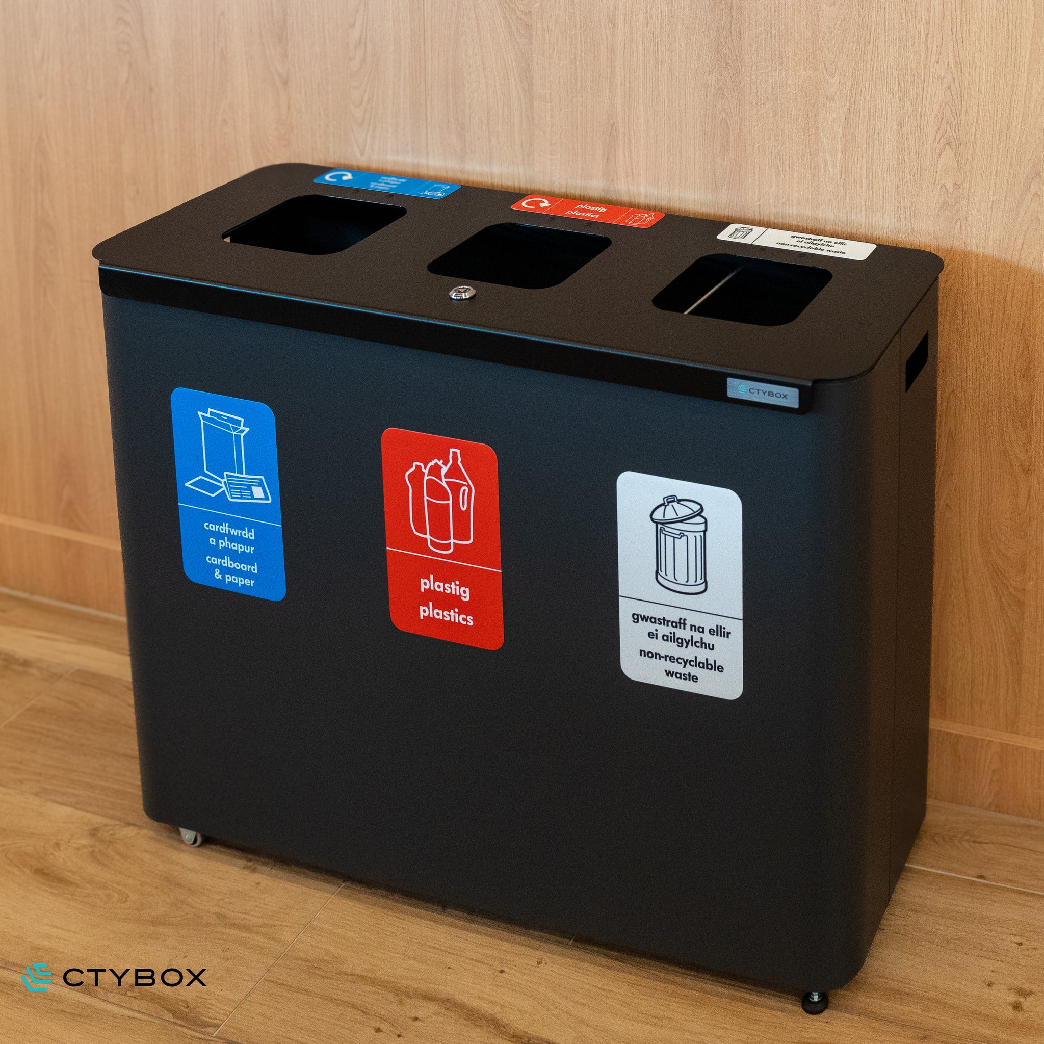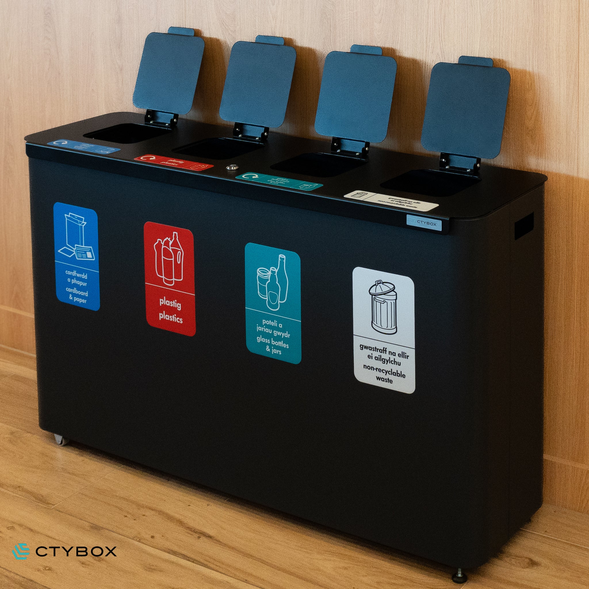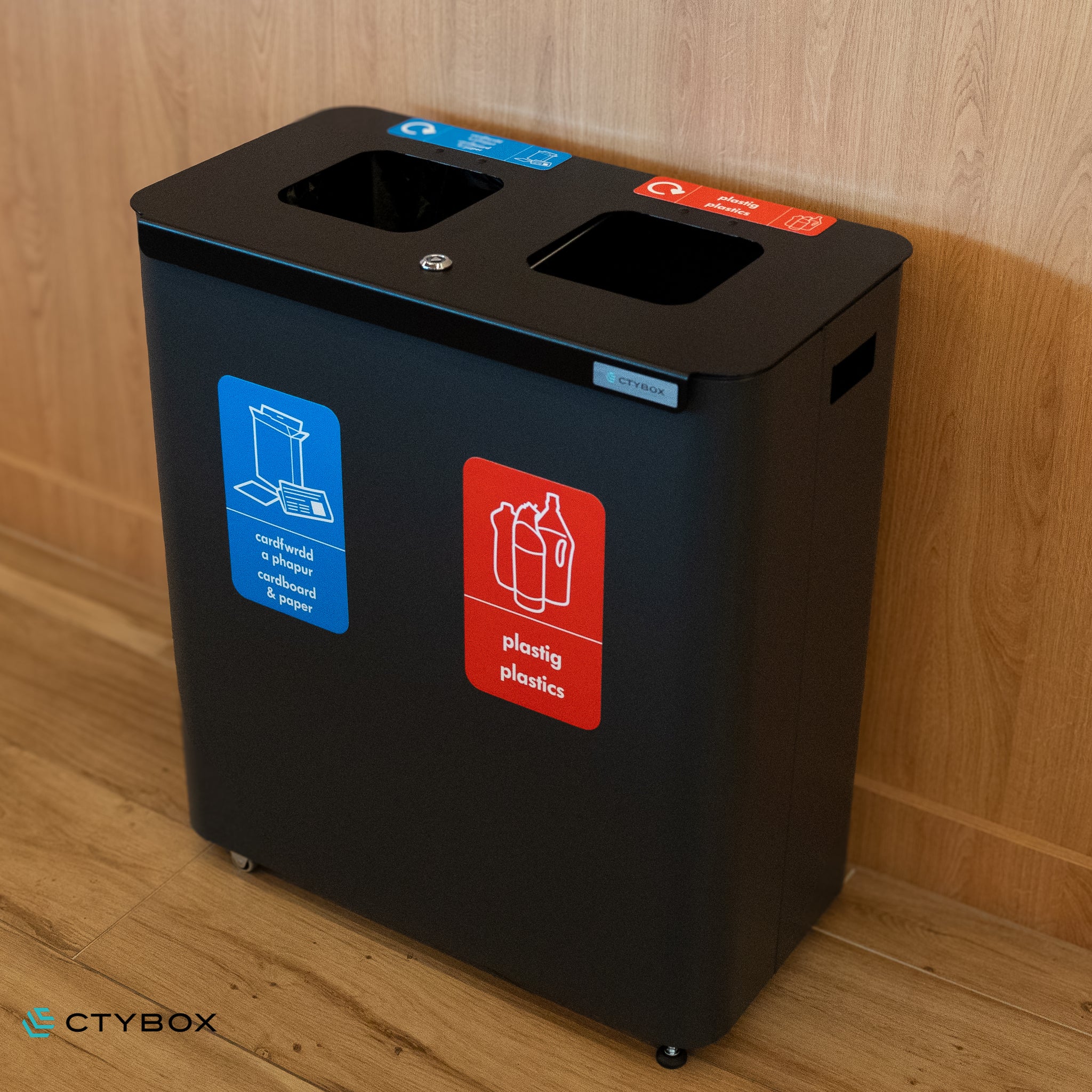 - Stylish and modern looking recycling station, perfect for various environments from offices and recreational spaces to airports and more