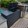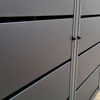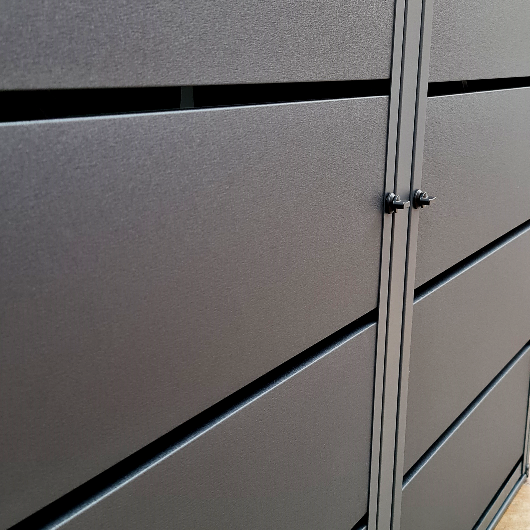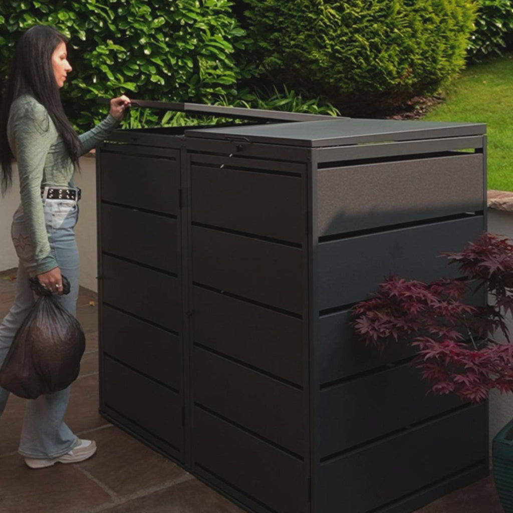 Thanks to the dark colour and wide, horizontal panels, this waste bin store oozes minimalism, is consistent with modern architecture and perfectly harmonizes with your outside space. Along with its elegant aesthetic, the bin enclosure has been designed for comfortable every day use with versitile two-sided doors for adaptable placement around your property. The top cover is equipped with actuators that ensure ease of use while the base features an overrun strip to facilitate the effortless insertion and display of the bins.